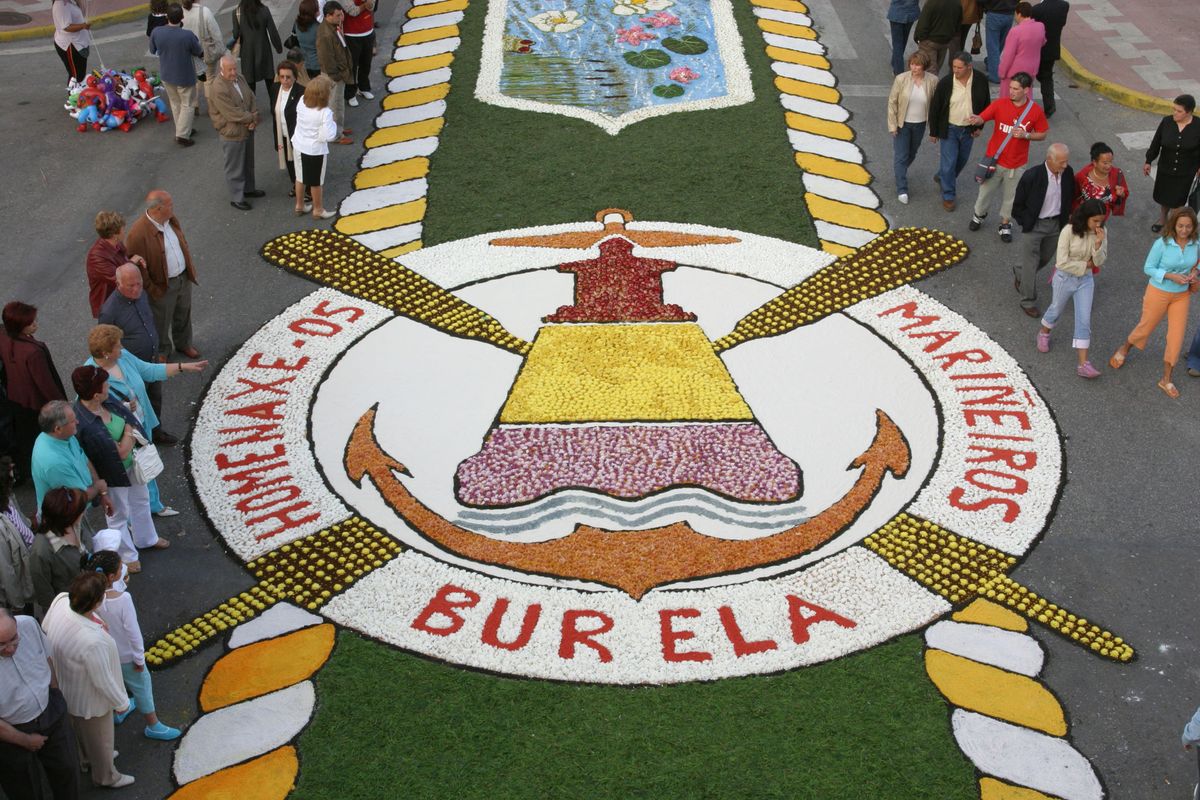 ALFOMBRAS FLORAIS. Moitas vilas son as que crean alfombras florais para celebracións destacadas, mais as de Burela presentan unha singularidade. E é que o noso gran tapiz duns 3.600 metros cadrados cada ano ten como fío conductor unha temática distinta, que en moitos casos resulta ser do máis orixinal, afastándose das máis habituais neste tipo de representacións e facéndoo cada ano distinto, irrepetible, único.