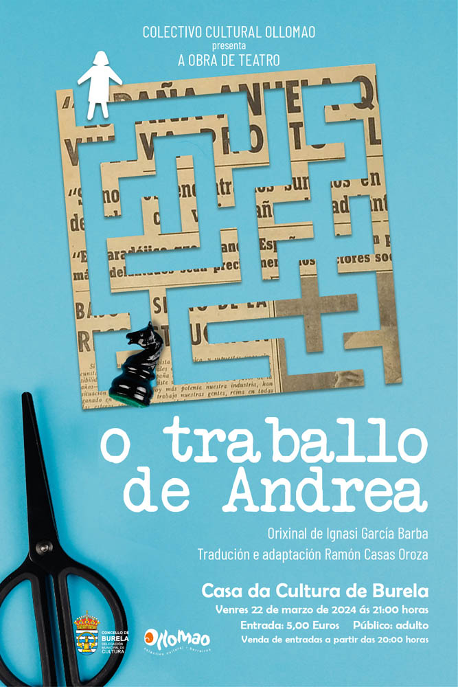 Burela, 20 de marzo de 2024. O Concello de Burela acolle esta fin de semana, no auditorio da Casa da Cultura, dúas representacións teatrais. A primeira será a de ‘O traballo de Andrea’, a cargo do Colectivo Cultural Ollomao, e a segunda, a de ‘Güela-Güela’, de Galitoons.