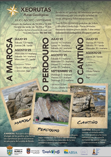 Y para descubrir estos tesoros geológicos se proponen tres rutas geológicas a lo largo del litoral burelés: desde el paseo marítimo de la playa de la Marosa hasta la playa del Cantiño, pasando por la zona del Perdouro, en las inmediaciones del puerto de Burela, y otra poe el Monte Castelo, gozando además de unas excelentes vistas al mar Cantábrico.
