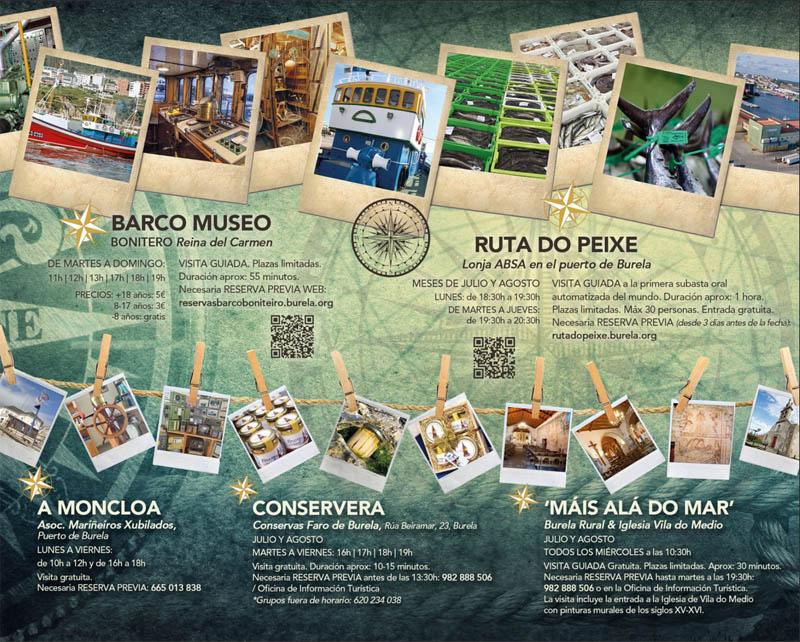 A Asociación de Mariñeiros Xubilados e Afíns “A Moncloa” tamén ofrecerá visitas guiadas, así como Conservas Faro de Burela. A visita “Máis alá do mar” invita a descubrir a Burela rural e a Igrexa Vila do Medio.