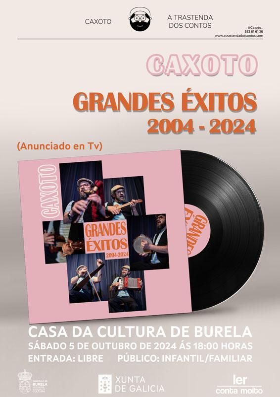 Para celebrar as dúas décadas vivindo do conto, Caxoto fai unha selección de todas estas cantigas, contos e xogos neste “Grandes éxitos 2004-2024”. Un espectáculo divertido e participativo para todos os públicos… e todas as gorxas.
