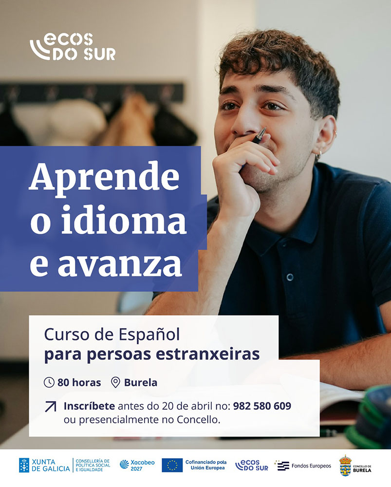 Burela, 16 de abril de 2026. Burela acollerá dous cursos formativos dirixidos a persoas estranxeiras, organizados por Ecos do Sur. Por unha banda, desenvolverase un curso de preparación para a proba CCSE do Instituto Cervantes, cunha duración de 40 horas. Por outra, ofértase un curso de español para persoas estranxeiras, cun total de 80 horas de formación.